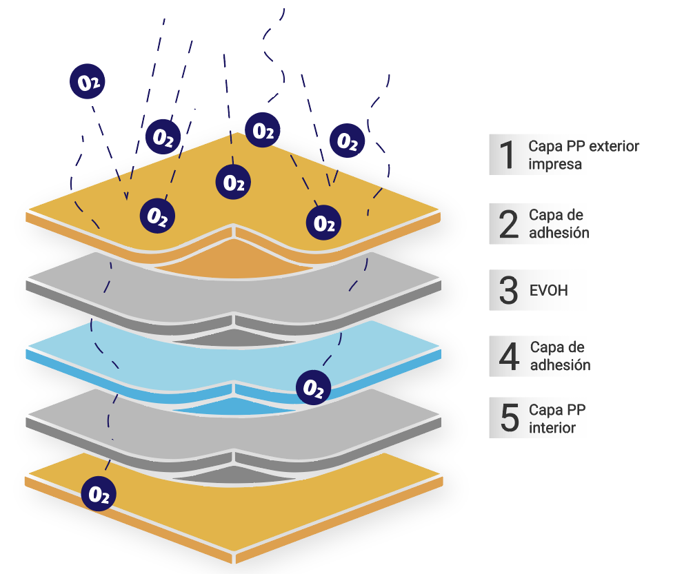 La etiqueta incorpora capas EVOH que reducen la transmisión de oxígeno y prolongan la vida útil del producto. Ideal para alimentos refrigerados o sensibles a la oxidación.